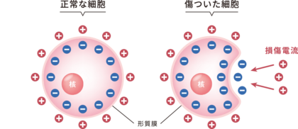 疲労やケガ、病気、ストレス等で細胞や組織が損傷すると損傷電流が働き、損傷した細胞を修復してイオンのバランスを整えます。